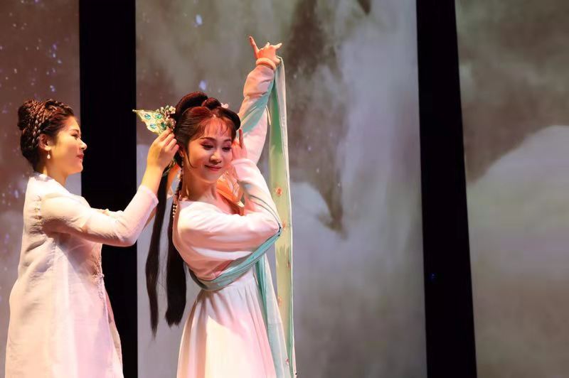 比如唱至《蝴蝶梦》,助手演员边舞边为李旭丹带上一枚蝴蝶头饰,她披上一根丝带,就是庄周之妻田秀了。