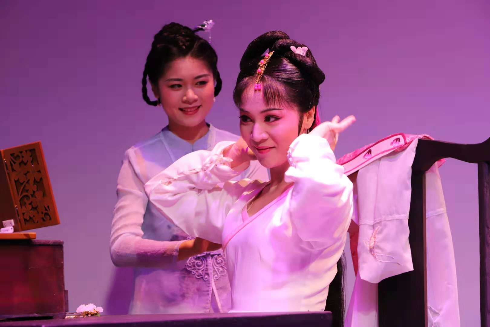 舞台一角的梳妆台点了“闺秀”的题,也为她的赶妆提供了一方演绎表现的空间。