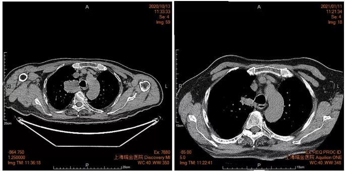 左图:2020年10月(治疗前)CT;右图:2021年1月(治疗后)CT