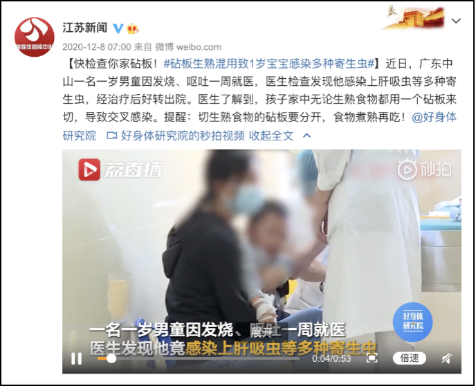 2020年末,广东中山1岁男童因发烧、呕吐就医,被检查出感染上肝吸虫等多种寄生虫。而原因就是家中长期用一个砧板生熟混切,导致了交叉感染。
