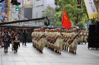 半个多世纪前解放军进城的那一幕场景,今天上午在南京路步行街重现——拥有百余年历史的永安百货公司门前挂满了各色彩旗,路边围观的群众,欢呼雀跃地载歌载舞、打着腰鼓,还有人打出了“军民一家亲”等横幅,道路中央100名身穿淡黄色旧式军装、手握长枪的解放军战士,排着整齐的队列缓缓前进……