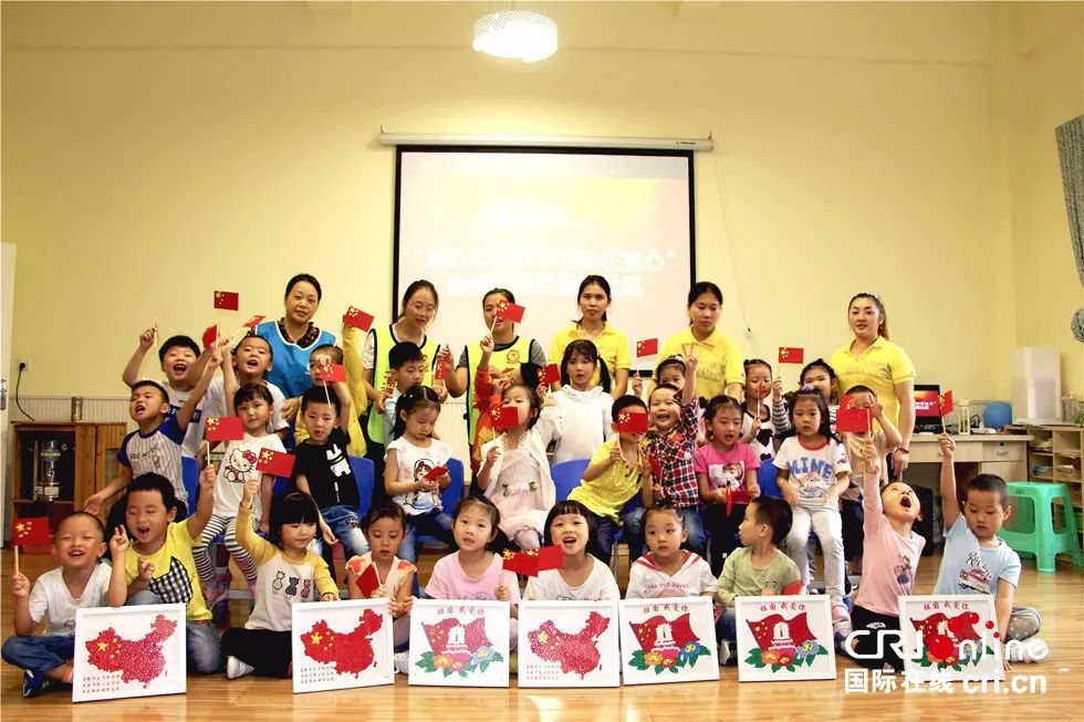图为沈阳某幼儿园内,老师带着小朋友们用魔方拼出了一面五星红旗。摄影:李子平