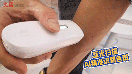 现场,工作人员在产品发明家的手臂上试了一下,原本布满斑点的手臂,瞬间变得光洁无暇。