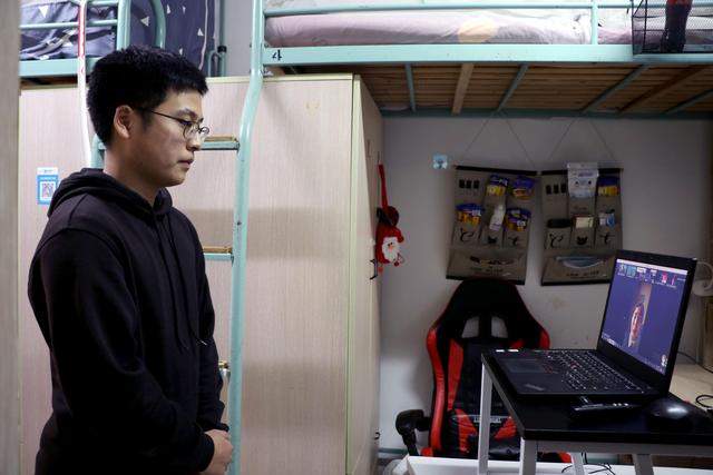 3月30日,上海海洋大学2022届毕业生在宿舍内参加线上面试。新华社发