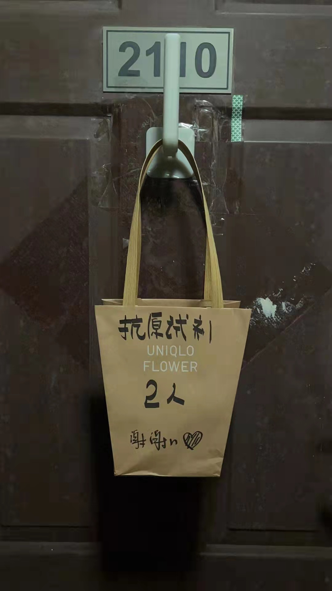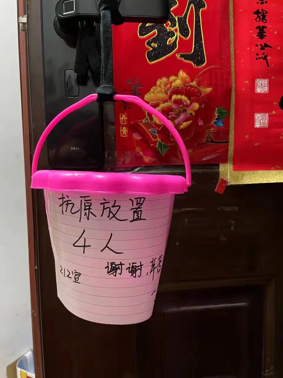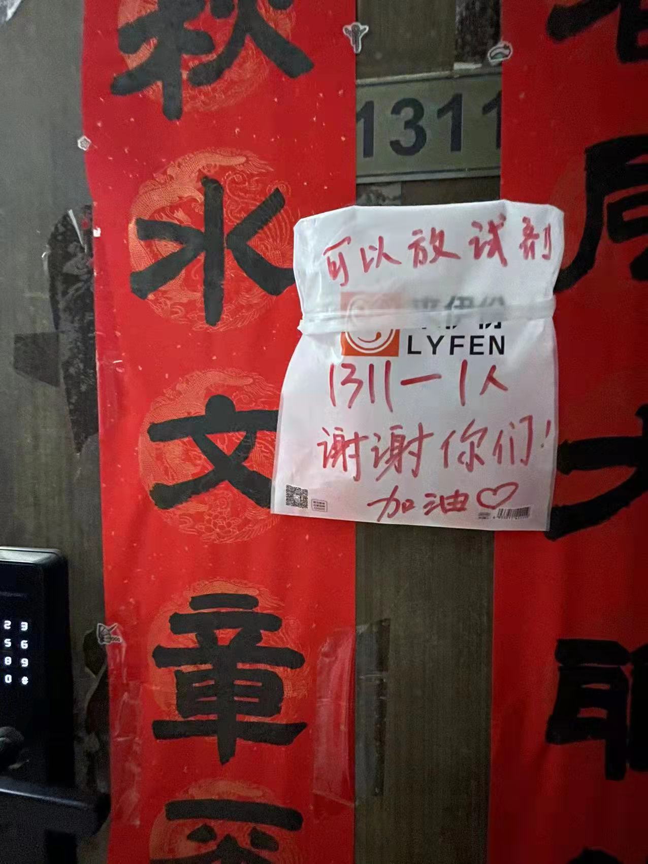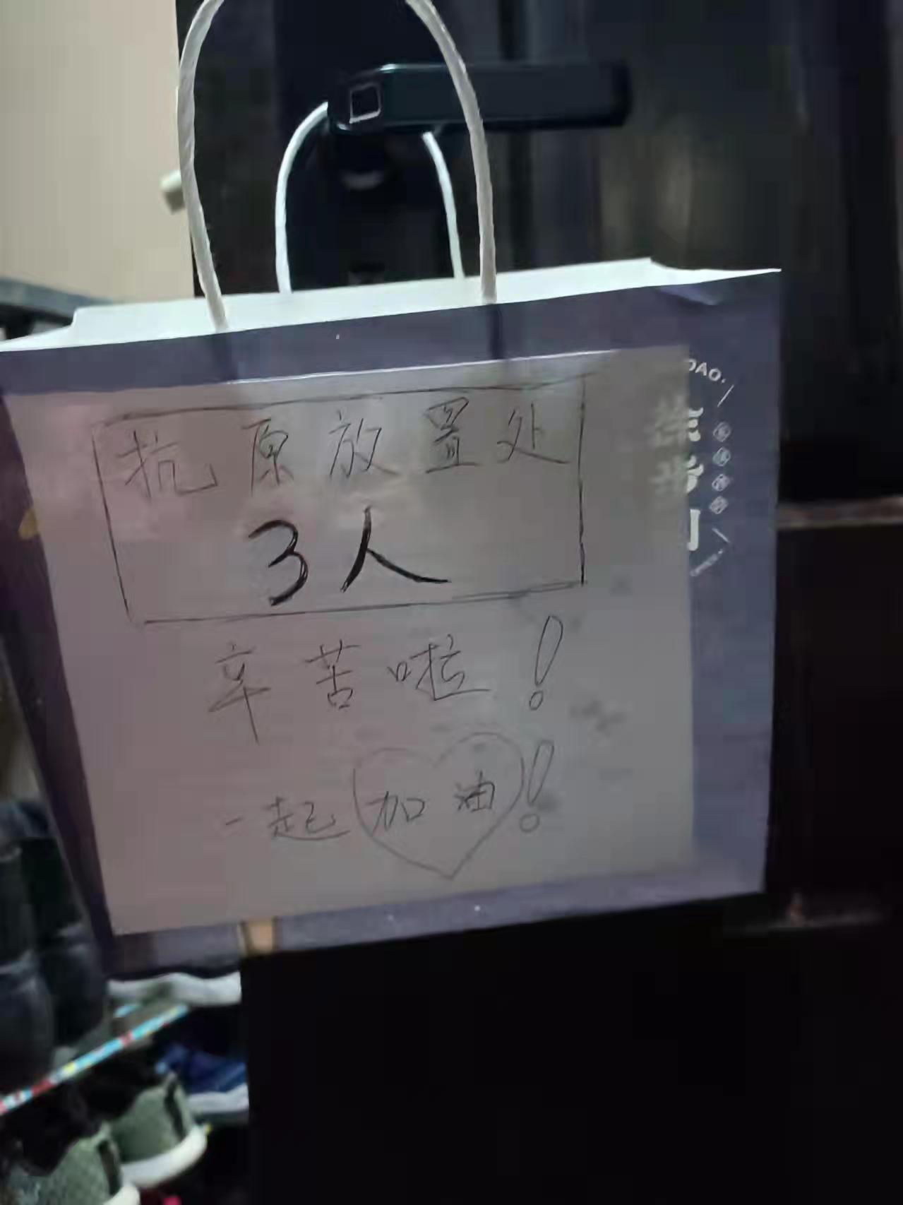 今天(3日),上海在全市进行抗原检测。不少居民自发在入户门外挂上塑料袋或者粘上纸盒,标明人数,方便工作人员用无接触方式发放抗原检测试剂。