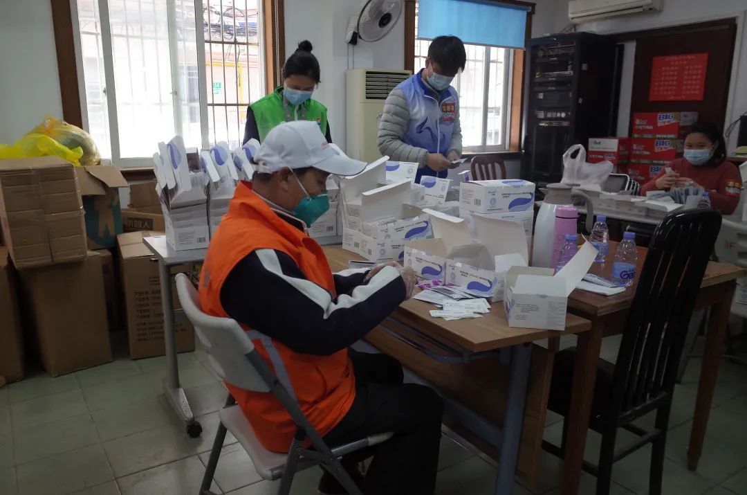 一大早,居民志愿者钱国峰就主动来到居委会“揽活儿”,不到一小时,由他打包好的抗原袋已堆满一整箱。这次他意外收获了一个搭档——坐在对面的胡玮,“我们都是机关党员就地报到的,今天碰巧发现我俩都是检察院系统的。” 钱国峰在静安区检察院工作,胡玮是虹口区检察院工作人员,已在小区服务多天。得知他们都在检察院工作,志愿队伍笑称“我们又多了一对搭档”。