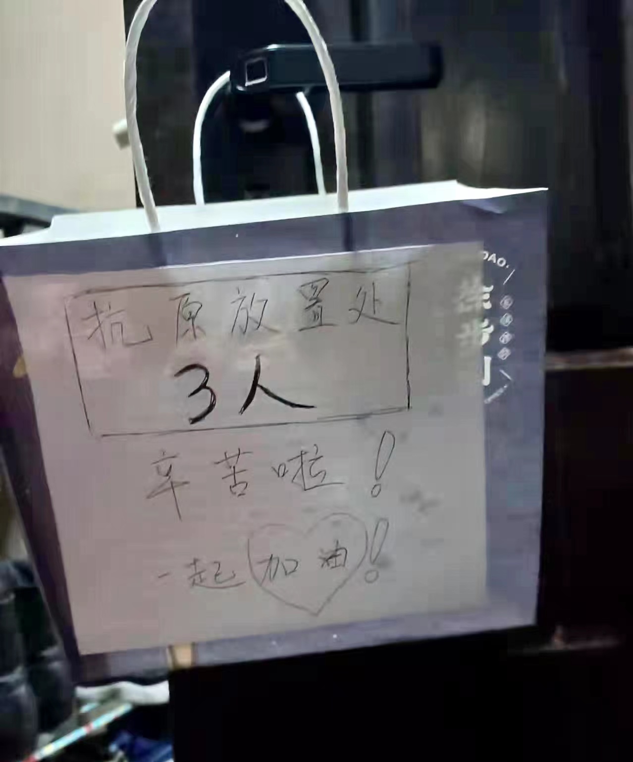 饼干盒、小篮子、小水壶,甚至还有保温杯套……这些临时自制的容器上还附着“3人,谢谢”“1人份,辛苦了”等暖心话语。事实上,这样的好点子,正是来源于不少居民区的业主群,大家群策群力,想到了这样的一种“无接触”式投放抗原试剂的方法,安全的同时,也方便志愿者工作。