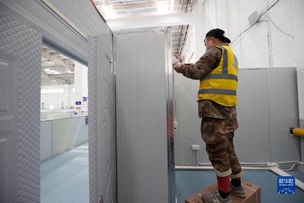 4月6日,工作人员在上海临港方舱医院即将投入使用的区域检查电路情况。