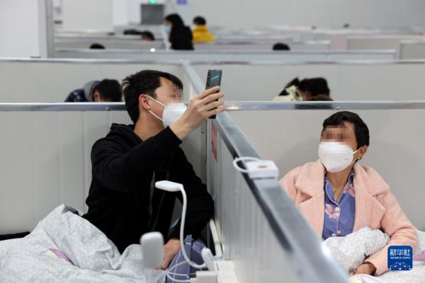 4月6日,在上海临港方舱医院,一对母子在与家人视频聊天。(华山医院 供图)